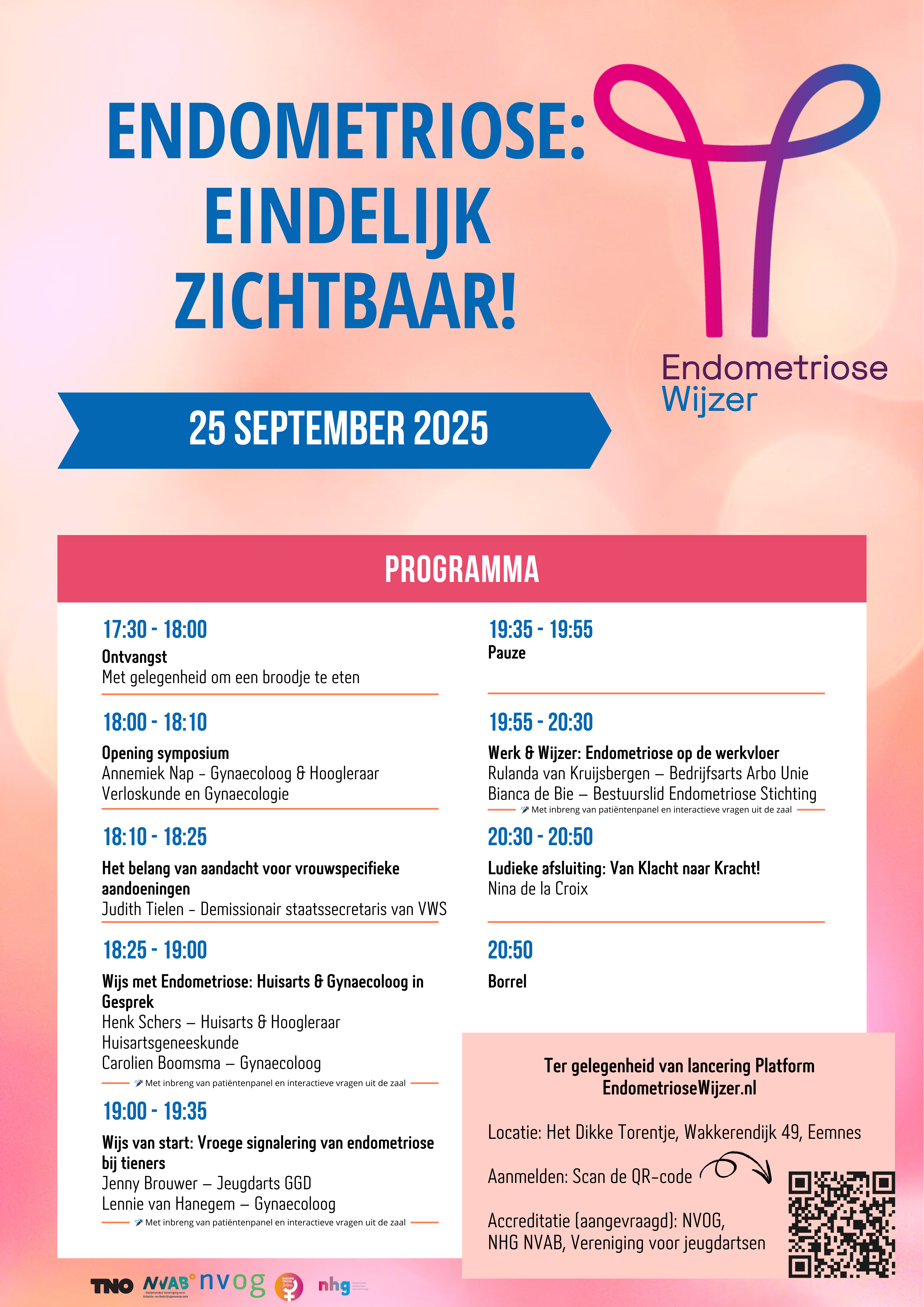 Een gevarieerd en interactief programma met o.a. jeugdarts Jenny Brouwer en gynaecoloog Lennie van Hanegem. Zij gaan in op de signalering van endometriose bij adolescenten — een doelgroep bij wie de klachten vaak vaag en moeilijk te duiden zijn.